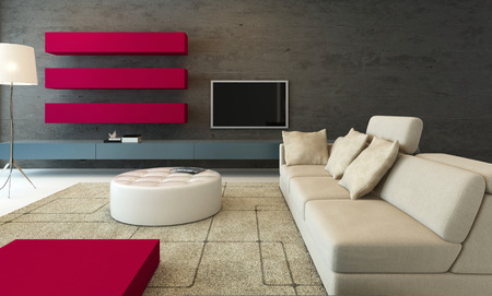 グレー色のピンクの家具とモダンなデザインのリビング ルームのインテリア の写真素材 画像素材 Image